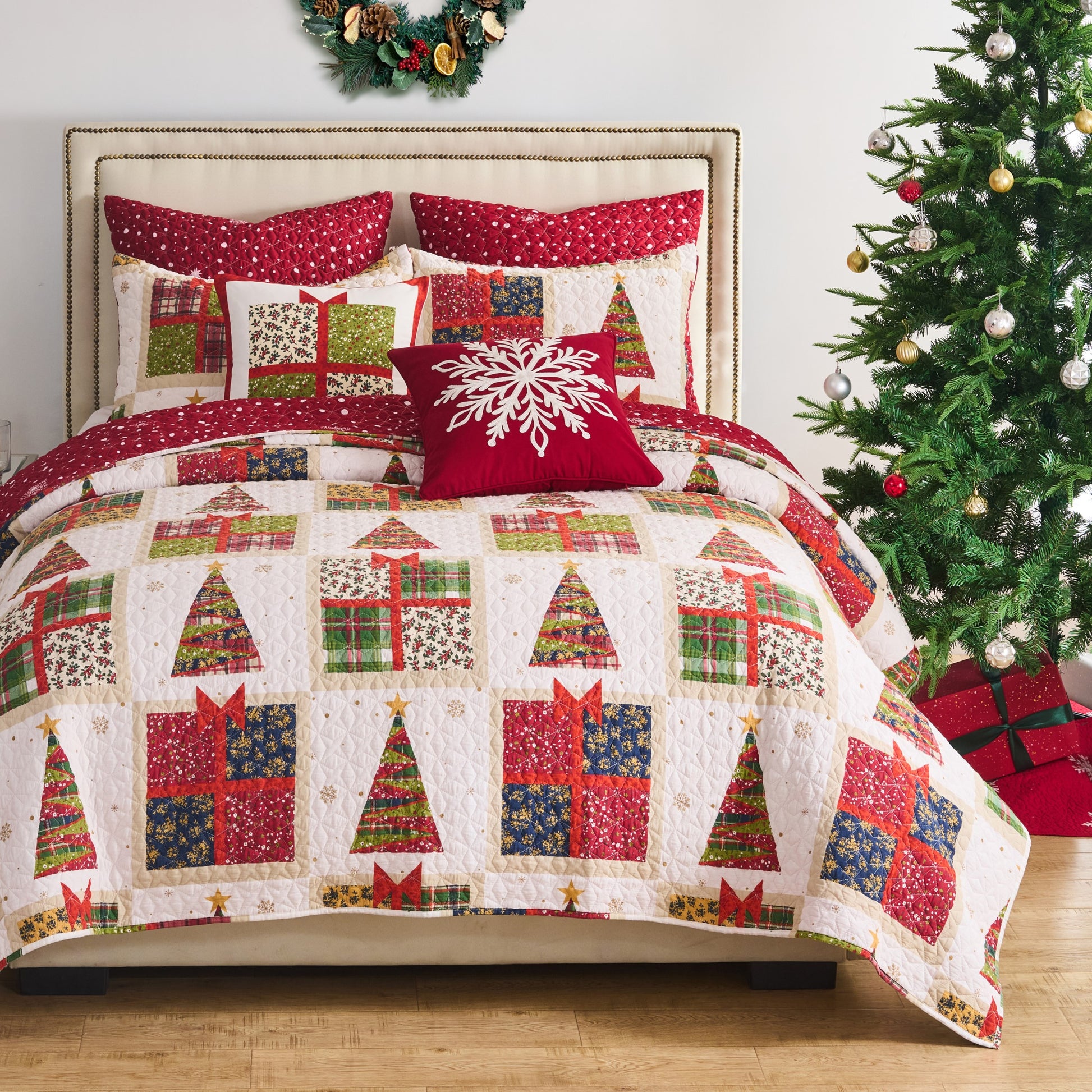 Bring the joy of the season into your home with this festive holiday quilt set from Greenland Home Fashions. Deck the Halls features stylized Christmas trees and presents in a patchwork-inspired design. A snowy white background sprinkled with golden snowflakes surrounds each gift and tree crafted from a mix of red, green, and gold plaids and florals. The reverse side offers a cozy twist with cheerful snowflakes falling on a bright red ground. Whether for a guest room or your own, this set captures the magic of Christmas morning. Each set includes a quilt and matching shams (one sham with Twin size).